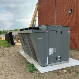 RV units typically mount on rooftops. However, the building鈥檚 roof could not support the seven units and required an alternate plan. Model RV offers flexibility in providing side duct connections in addition to standard connections eliminating the need for costly plenum curbs to supply fresh air to the building. This flexibility allowed for placement on concrete slabs next to the building.